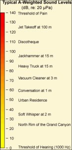 Noise is measured in units of sound pressure levels called decibels, named after Alexander Graham Bell, using A-weighted sound levels (dBA). The A-weighted sound levels closely match the perception of loudness by the human ear. Decibels are measured on a logarithmic scale which means that a small change in the number of decibels results in a huge change in the amount of noise and the potential damage to a person’s hearing.